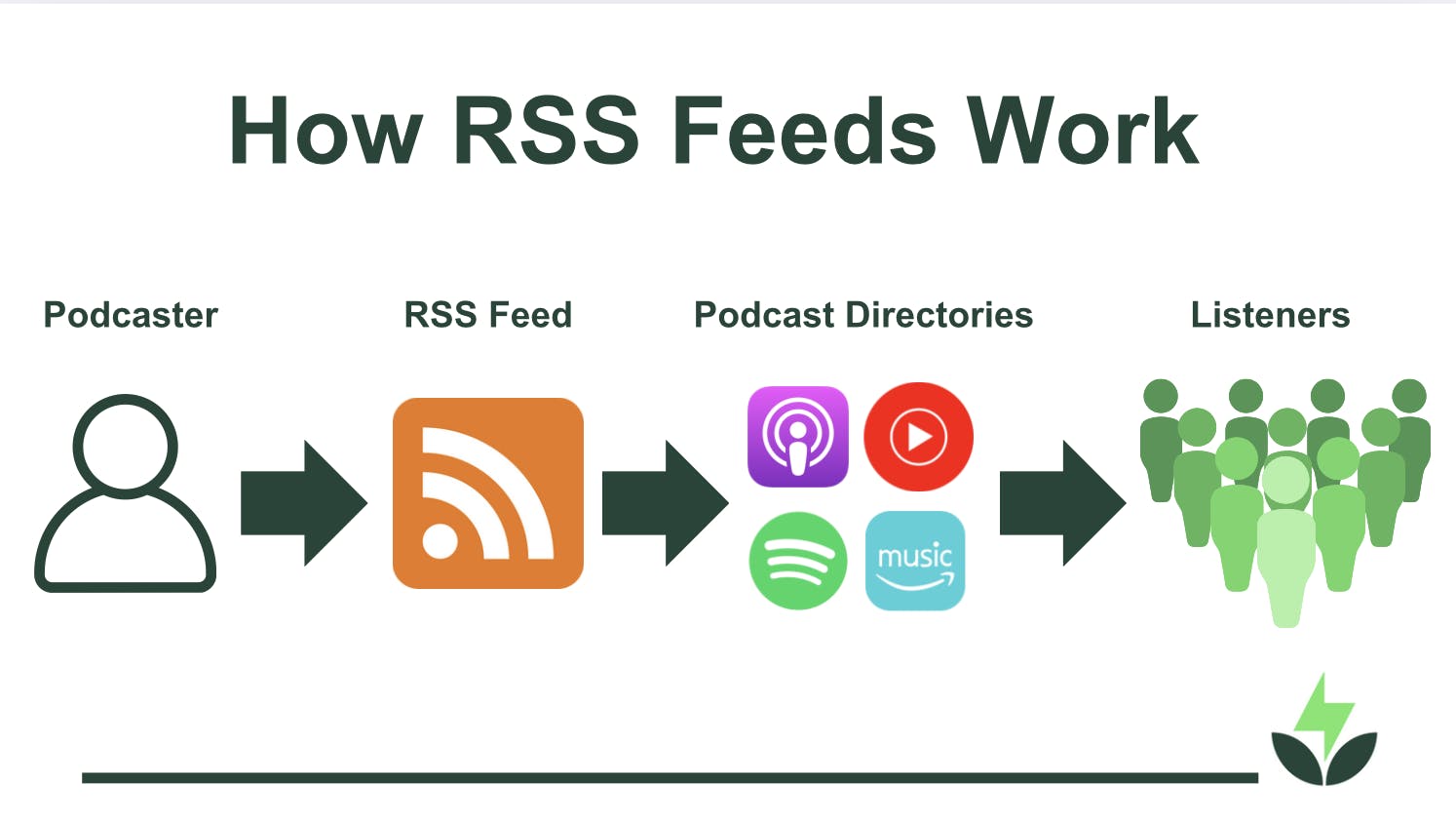 Your RSS feed is essential because podcast directories require it to list your show. Most people find and listen to podcasts using directories like Apple Podcasts (formerly iTunes) and Spotify, which pull your podcast episodes and new content from your RSS feed. Without one, directories can’t list your podcast, and potential listeners won’t be able to find it.